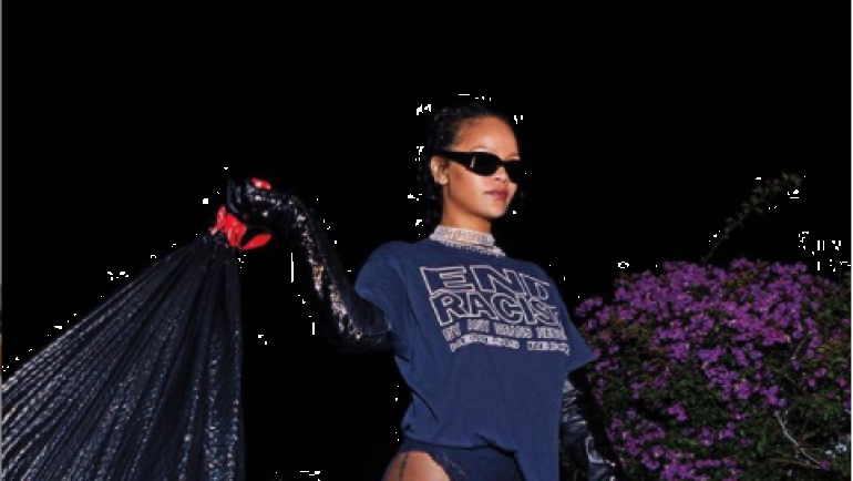 "Тук съм, за да помогна", гласи текстът. Риана качи снимката в Instagram часове след встъпването в длъжност на новия президент на САЩ. Тя е от миналогодишна фотосесия на певицата. На нея Риана носи блуза с надпис "Да спрем расизма по всеки възможен начин", както и два черни чувала с боклук.